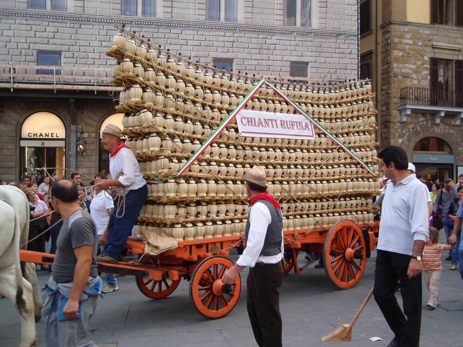 Enquanto as garrafas de vidro eram feitas na cidade de Florença, o vinho era produzido ao ar livre na zona rural circundante e o Carro Matto mostra como as garrafas eram empilhadas com maestria em uma pirâmide para serem transportadas com segurança para onde eram enchidas. São mais de 2000 garrafas no carrinho e hoje, como então, poucas pessoas conseguem criar esta obra-prima da arquitetura artesanal! Aqui o Carro Matto recria o momento da chegada à cidade vinda do campo da carreta com garrafas cheias do novo vinho, recebido com o mesmo entusiasmo e alegria de então.